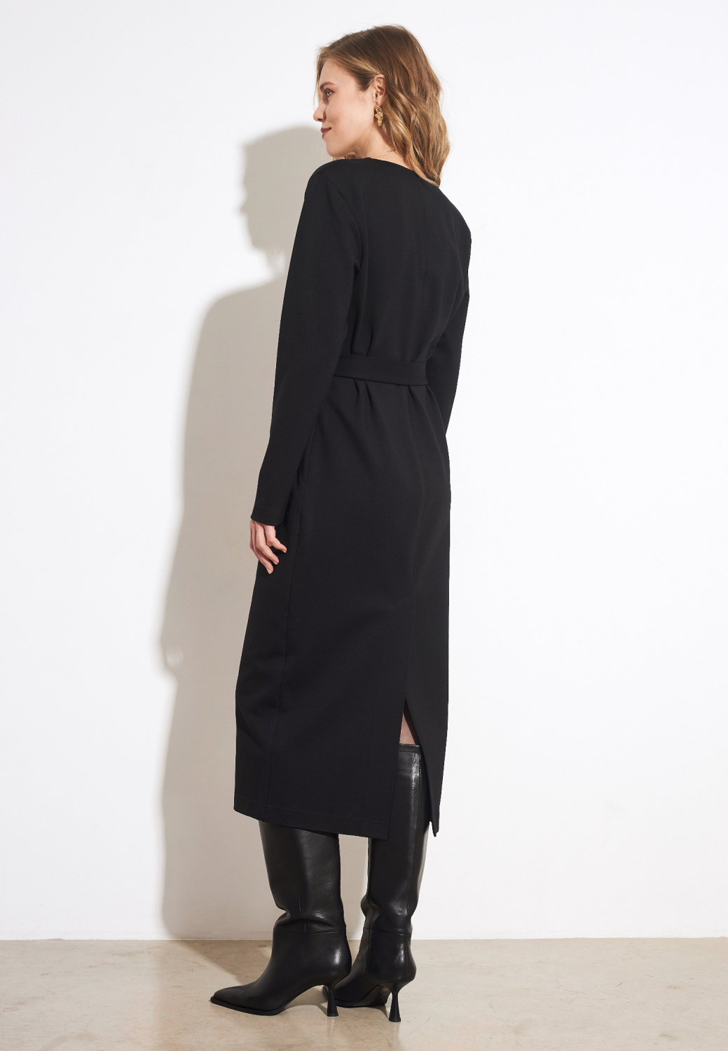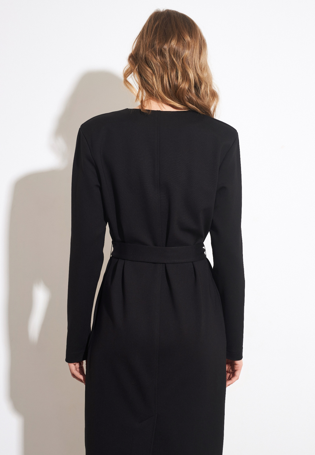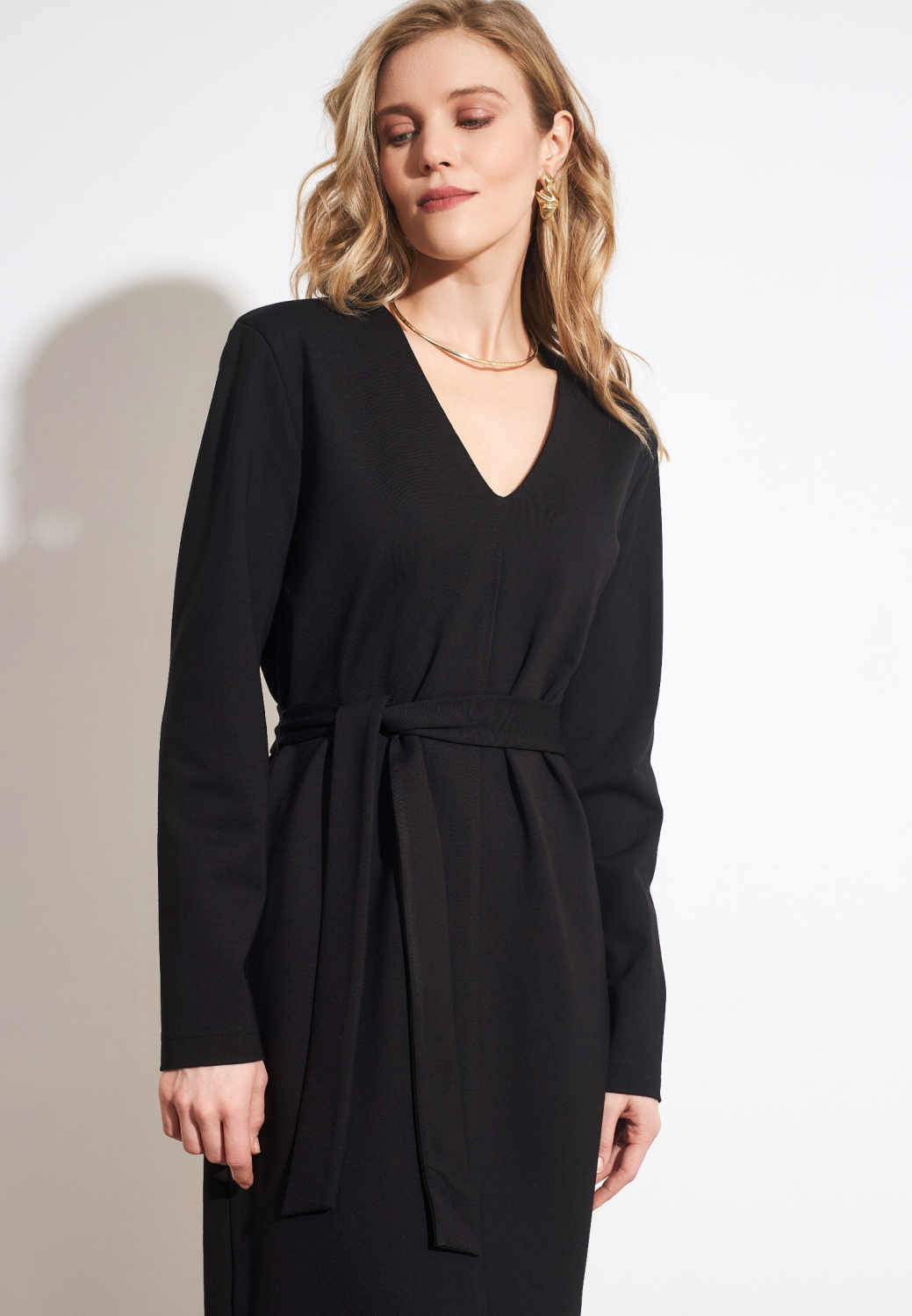 Элегантное платье черного цвета в длине миди идеально дополнит ваш базовый гардероб. Материал с высоким содержанием вискозы отлично пропускает воздух и приятен к телу. Пояс позволит подчеркнуть талию, а v-образный вырез подчеркнет ключицы.