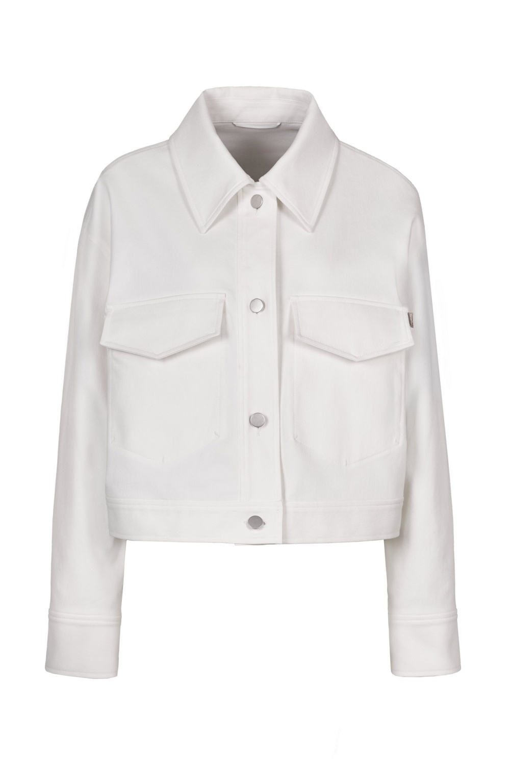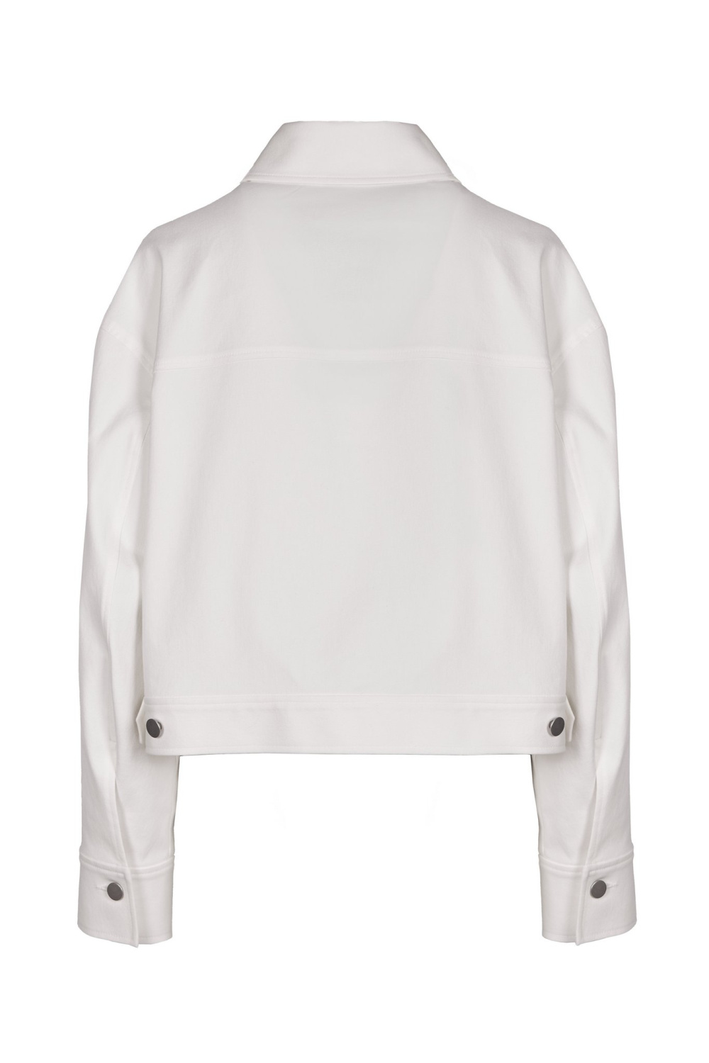Укороченная куртка из итальянского хлопкового денима белого цвета.  Модель декорирована отделочными строчками по переду, имитирующими фигурные накладные карманы с клапанами на груди. Материал премиального качества на основе хлопка мягкий, прочный и устойчивый к износу. Модель прямого силуэта, с притачным поясом по низу, стояче -отложным воротником, втачным рукавом с манжетой и центральной застёжкой на петли  и  джинсовые болты. Составит однотонный тотал-лук с платьем того же оттенка.