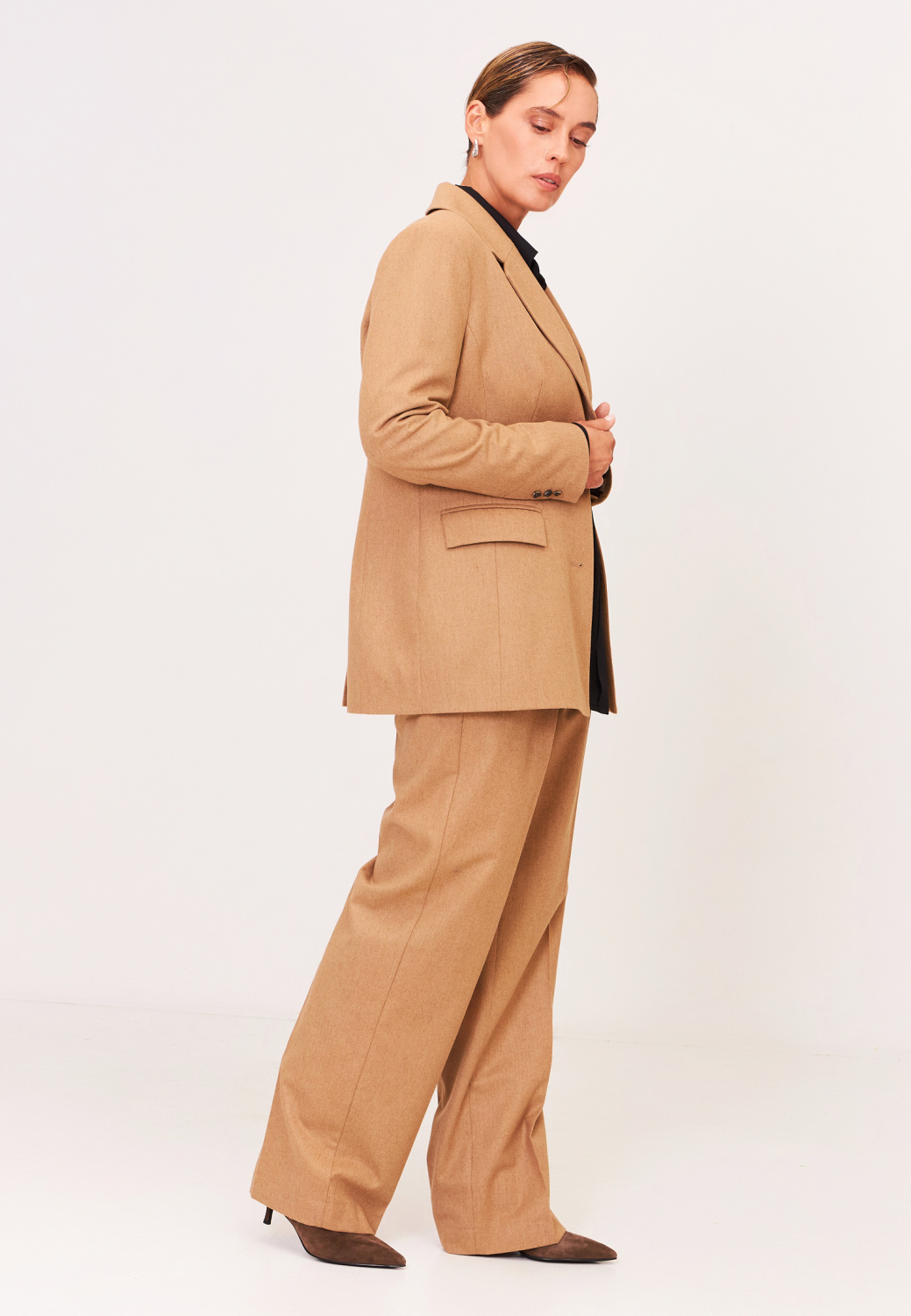 Классический жакет полуприлегающего силуэта подойдет как для формальных встреч, так и для создания повседневных образов. Незаменимая классика будет сочетаться с любым верхом: базовыми рубашками, атласными топами или трикотажными водолазками. Дополнить модель можно брюками из комплекта.